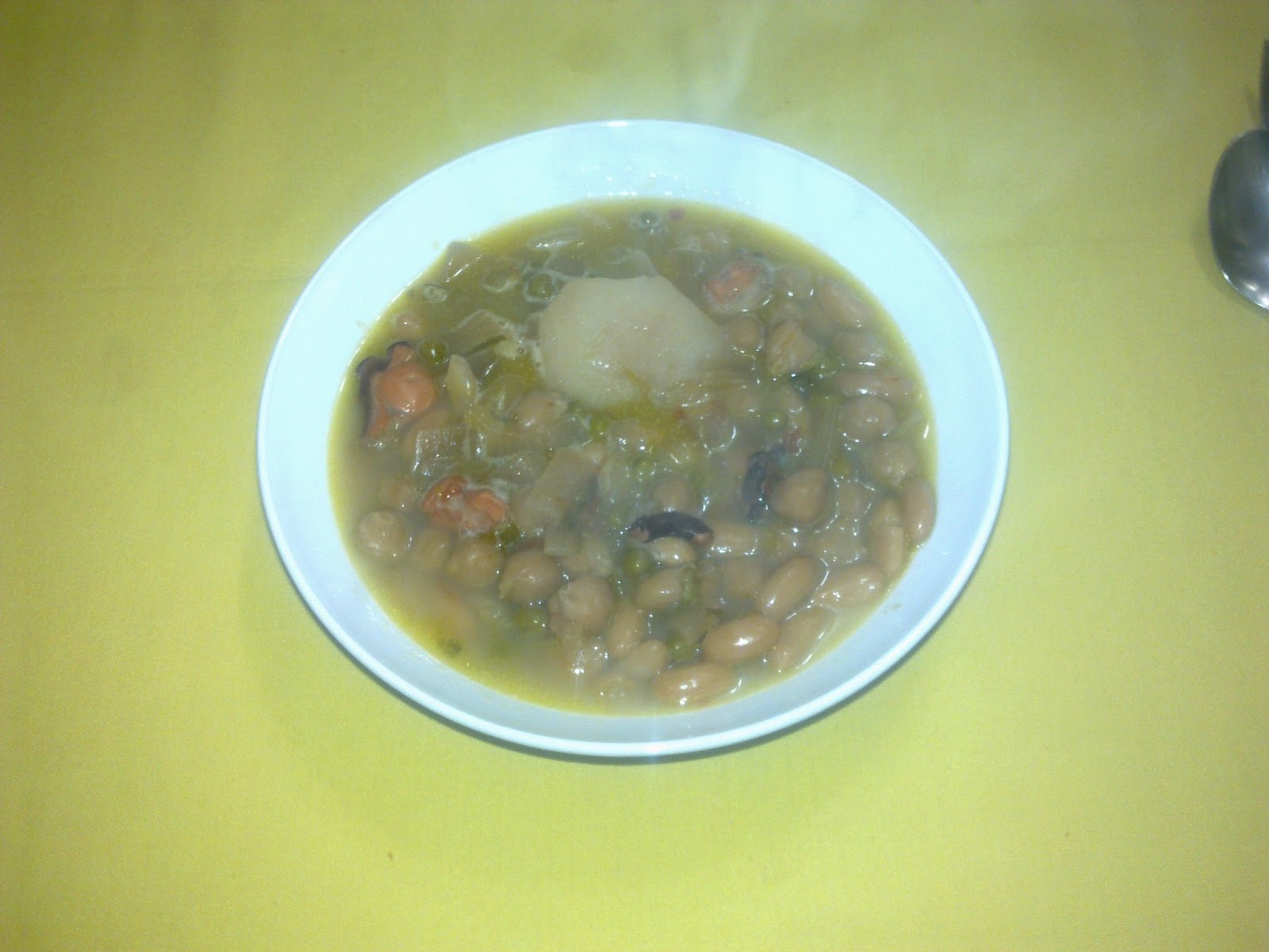 On a pressure cooker* put the chickpeas, the beans, the sliced octopus and a litre of water over medium heat without covering the cooker. When it starts boiling take out the spume on the top of the water.